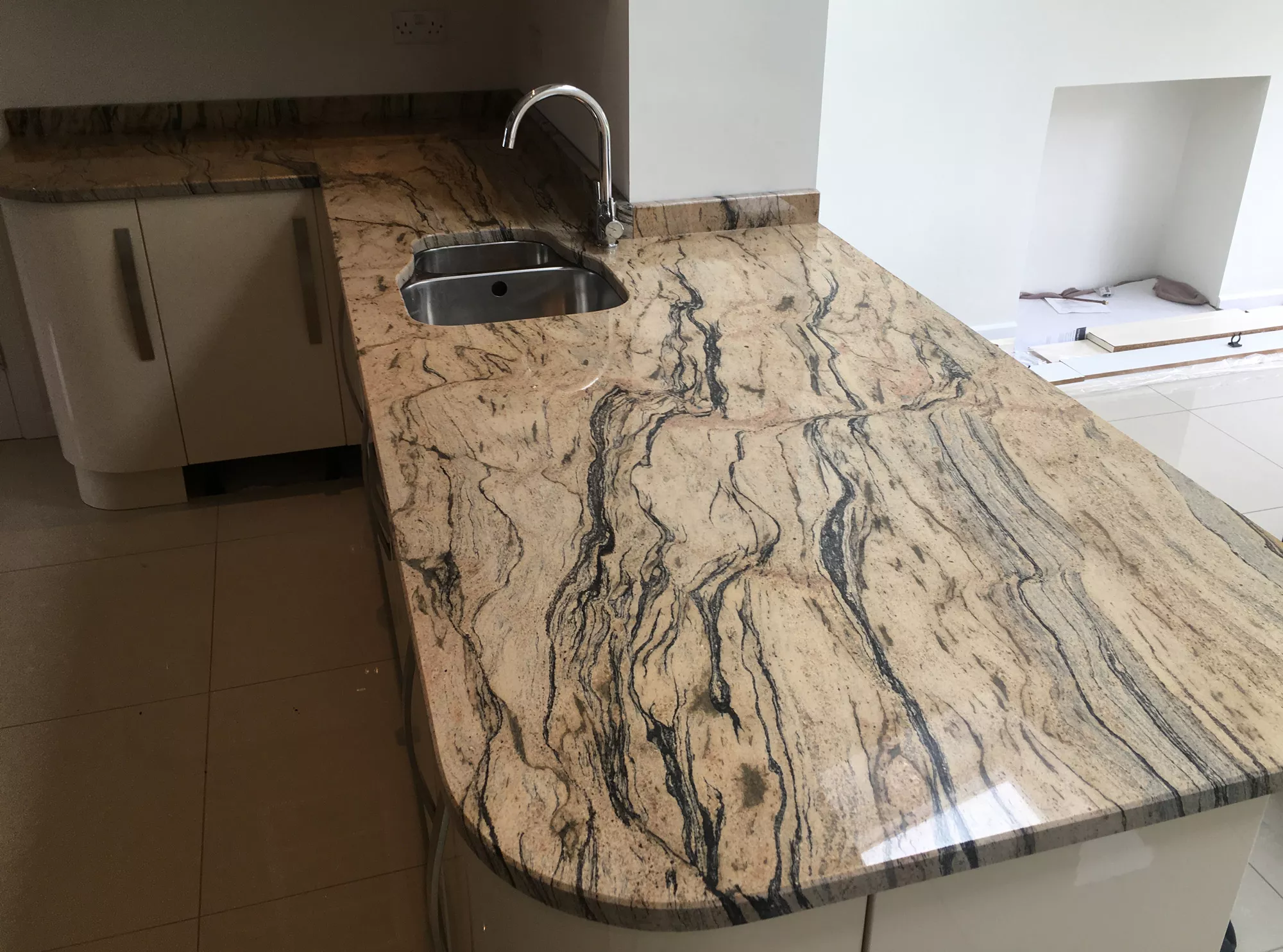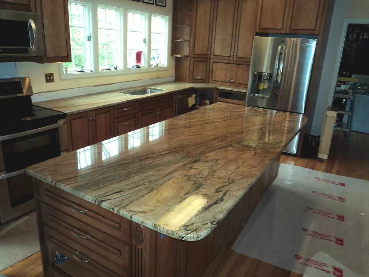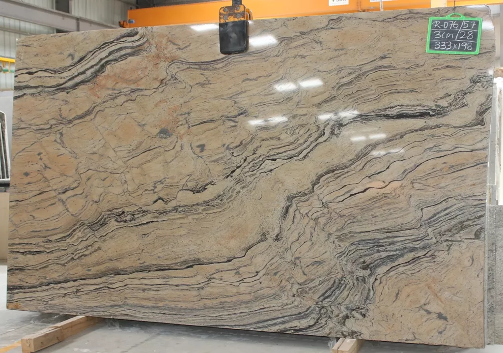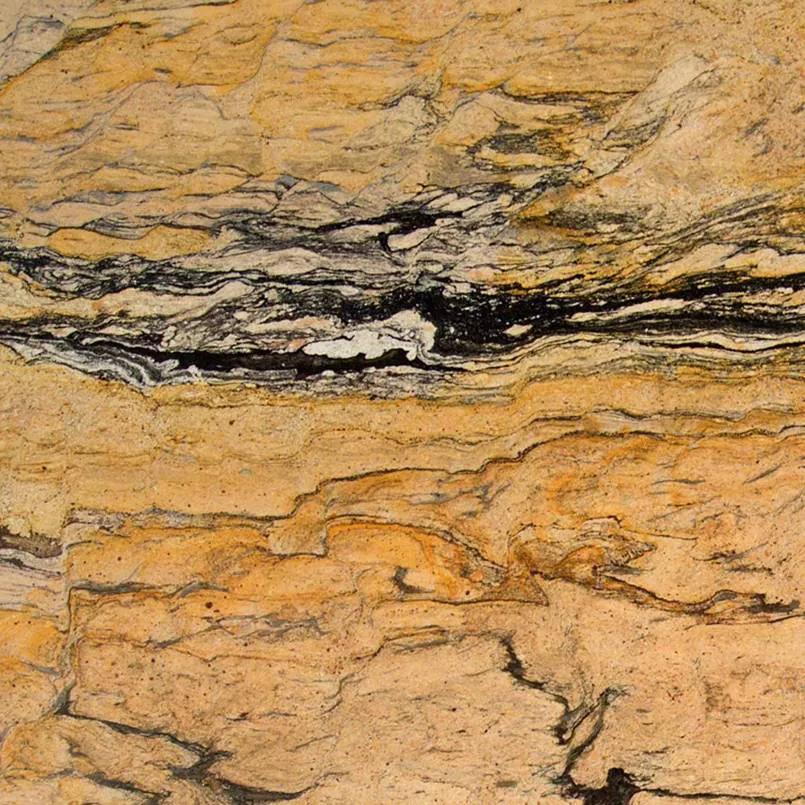 Данный камень выделяется теплым желтым цветом с характерным волнообразным рисунком из черных прожилок, за что получил свою популярность у дизайнеров интерьера при изготовлении столов и столешниц, а так же отделке стен и полов в кухнях, ванных комнатах, гостиных.
