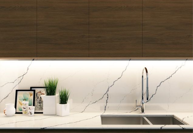 Greylac BQ-8738 - кварцевый агломерат. Это один из самых прочных искусственных камней из кварца. Он обладает монолитной, без трещин и пустот поверхностью, высокой износостойкостью, влагостойкостью и долговечностью. Хорошо выдерживает скачки температур и промораживание. Камень приятен в эксплуатации и не прихотлив в уходе.
