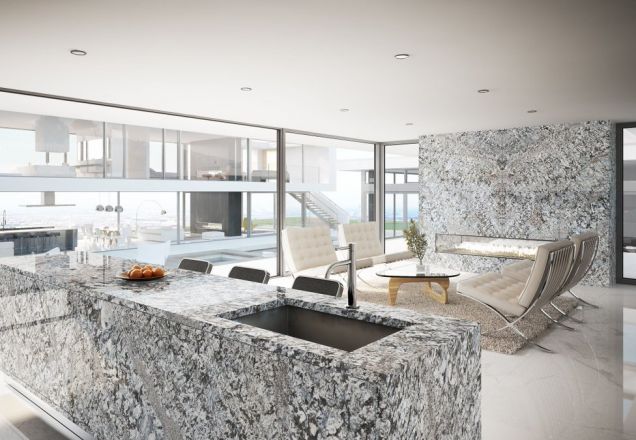 Камень является популярным при оформлении кухонного и гостиного интерьера из-за его нейтрального цвета, который визуально расширяет пространство. Также при работе внутри зданий гранит используют для оформления ступеней, балясин, сводов, полусводов, модульных полок, небольших элементов декора.