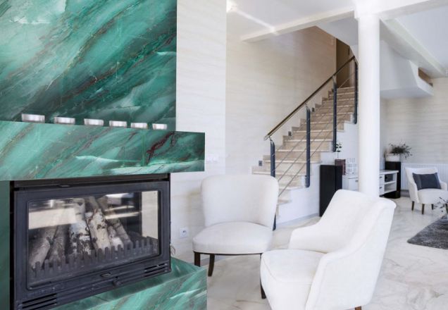 Основным достоинством гранита являются насыщенный изумрудный оттенок с вкраплениями слюды. Из-за глубокого цвета Эмеральд Грин (Emerald Green) используют в качестве доминантного материала в дизайнерских решениях.