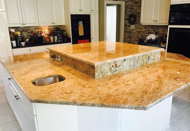 С практической стороны стоит отметить, что гранит Мадура Голд (Madura Gold) имеет среднезернистую структуру, благодаря чему камень процент и надежен в использовании. Из-за низкого влагопоглощения и жаропрочности широко применяют Мадура Голд (Madura Gold) в облицовке фасадов и цоколей, в отделке столешниц, барных стоек, каминов.