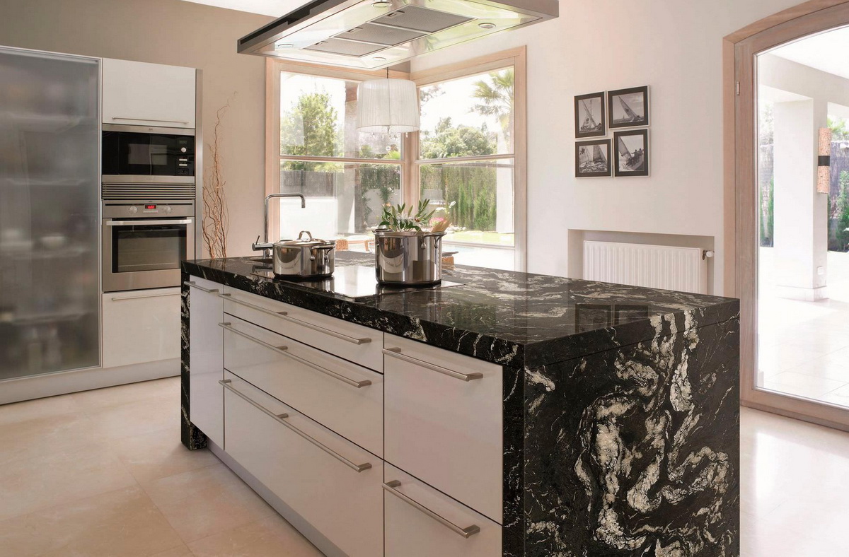Например, Титаниум (Titanium) применяют в интерьерах кухонь (мойки, столешницы, барные стойки), ванных комнат (раковины, душевые кабина, полы, стены), гостиных (полки, столы, подоконники, тумбы), холлов (ступени, мозаики).