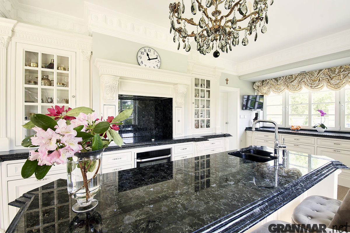 Визуальным преимуществом гранита Волга Блю является его насыщенная поверхность, сочетающая в себе оттенки черного и темно-зеленого. Гранит может выступать в роли основного материала и дополняющего, поэтому его легко сочетать с другими цветами.