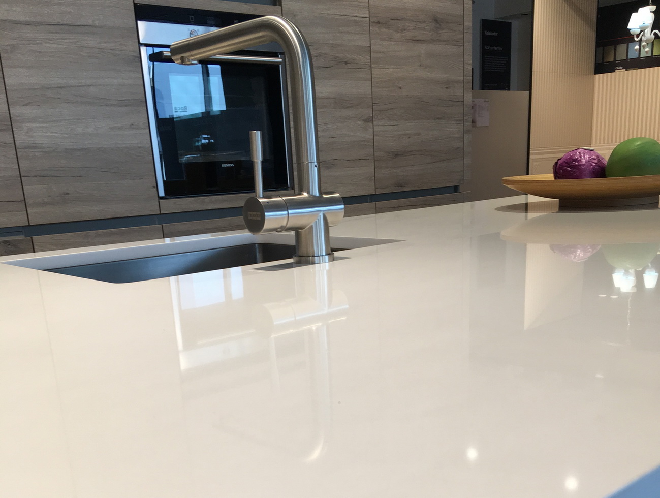 Кварцевый агломерат TechniStone Crystal Absolute White - экологически чистый камень Как и все изделия из Technistone, он отличается высокой твёрдостью, отсутствием пор и трещин на поверхности и в массе, демонстрируя исключительные эксплуатационные качества. Камень легок в обслуживании, поскольку не впитывает влагу и запахи. Уход за камнем прост, для уборки понадобятся лишь мыло и салфетка. Нет необходимости вычищать столешницу, достаточно просто протереть её поверхность. При эксплуатации кварцевый агломерат ведёт себя подобно стеклу: его поверхность идеально гладкая и без пор.
