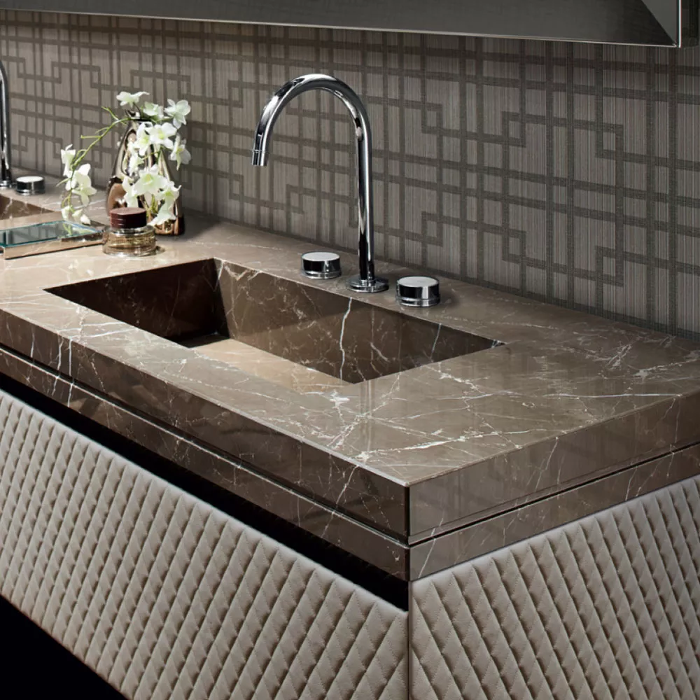 Бронзо Армани - роскошный материал для настоящих ценителей натурального камня. Его благородная поверхность нежного коричневого цвета покрыта белыми и темными прожилками. Данный вид мрамора совместим с различными интерьерными стилями и хорошо сочетается с такими материалами, как дерево, стекло и металл.