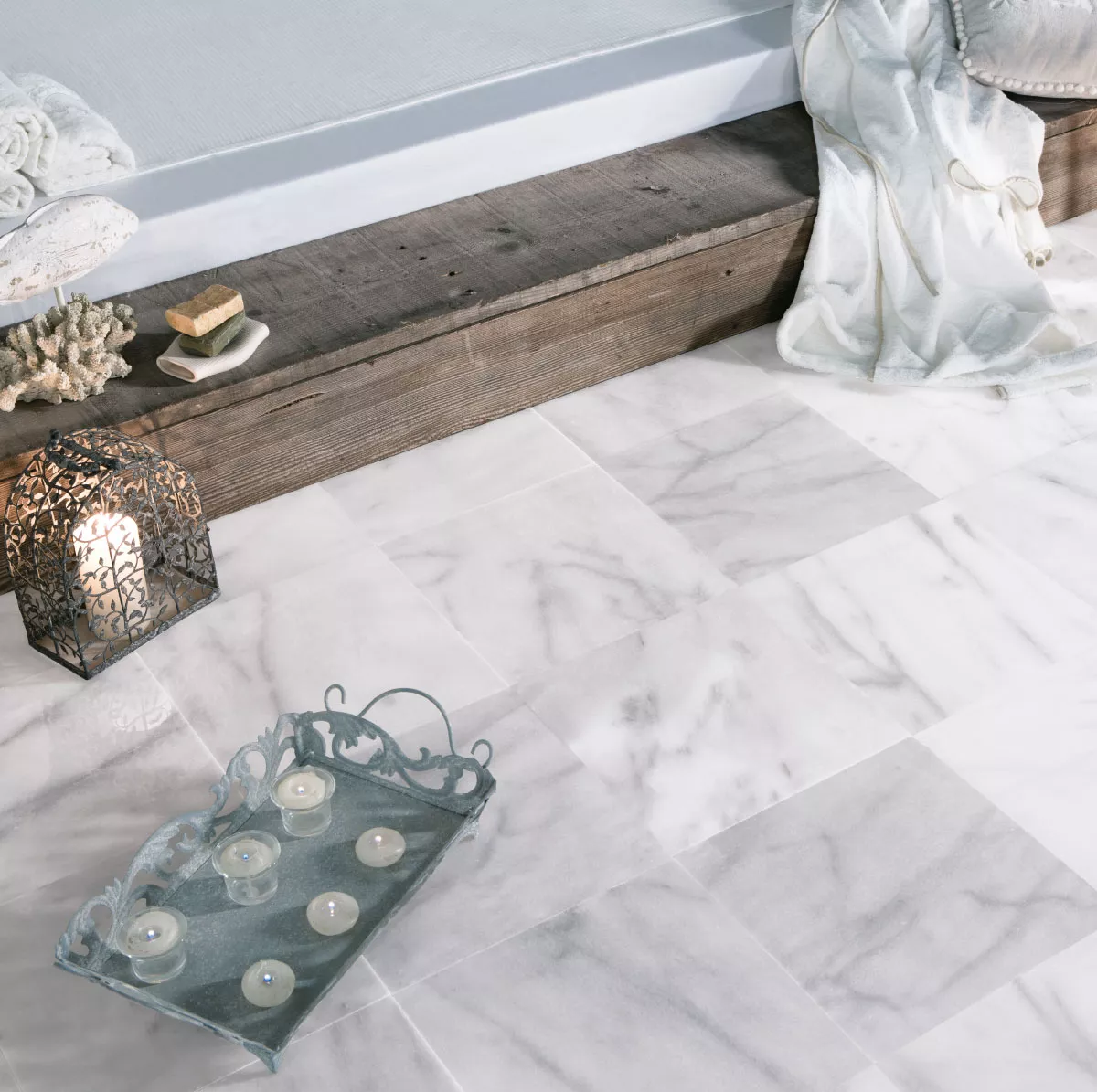 Белый цвет этого мраморного материала и его технические показатели свидетельствуют о том, что он прекрасно подходит для облицовки пола. Его слабое поглощение воды дает возможность использовать мраморную плитку для помещений ванной комнаты, туалетов, комнат кухни.