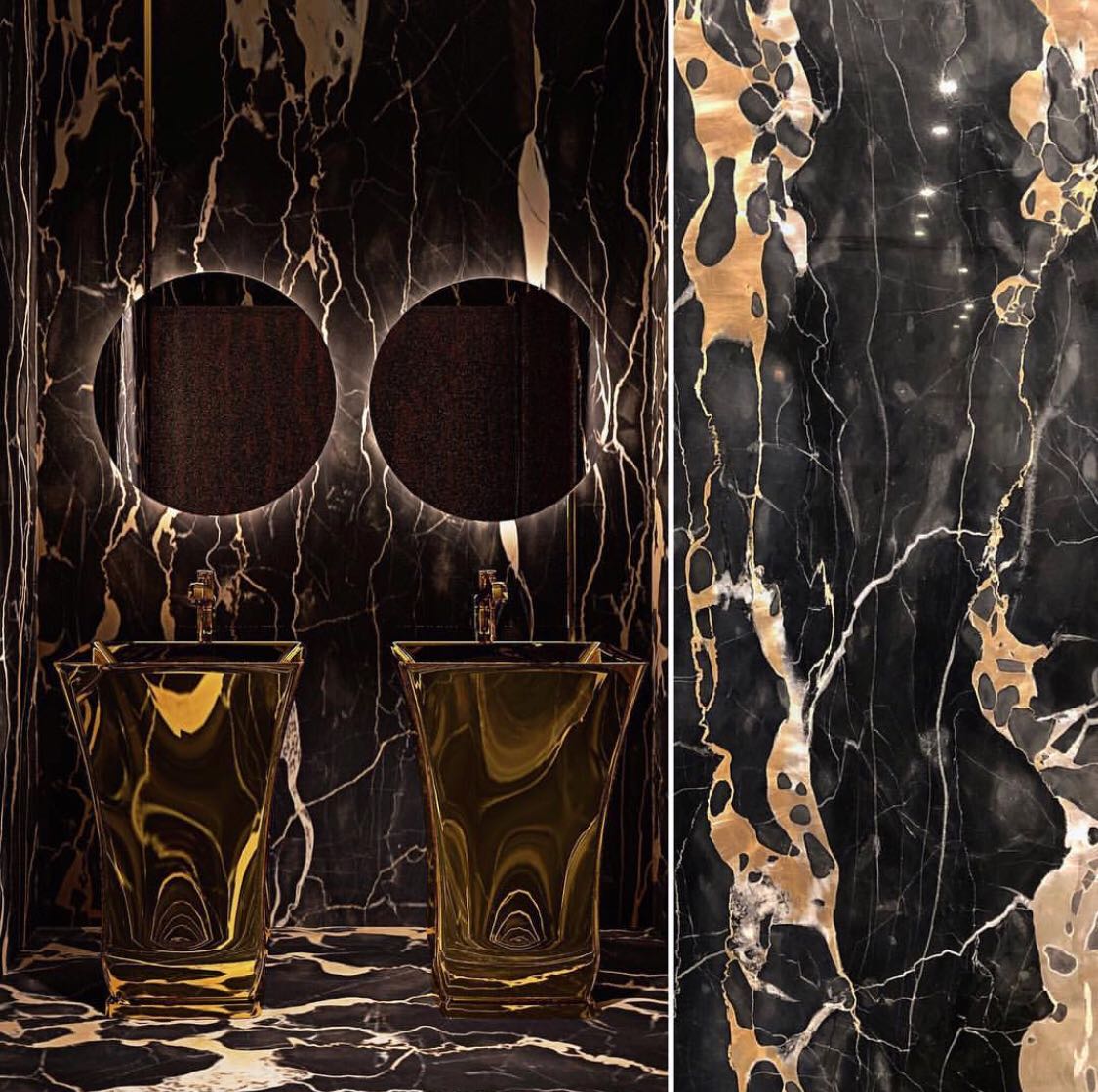 Мрамор Неро Порторо Экстра отлично смотрится на интерьерных изделиях: столешницах, стойках рецепшн, порталах каминов, раковинах. Не менее красив и популярен этот камень как облицовочный материал для стен и пола. Поверхность, покрытая им, смотрится очень аристократично и стильно.