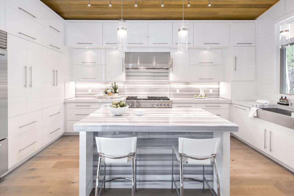 Мрамор Стриато Олимпико отличается уникальной фактурой с ровными тёмными полосами, которые делают его неповторимым. Спокойная серая цветовая гамма минерала отлично сочетается с другими цветами, а узор в виде горизонтальных линий зрительно расширяет пространство.