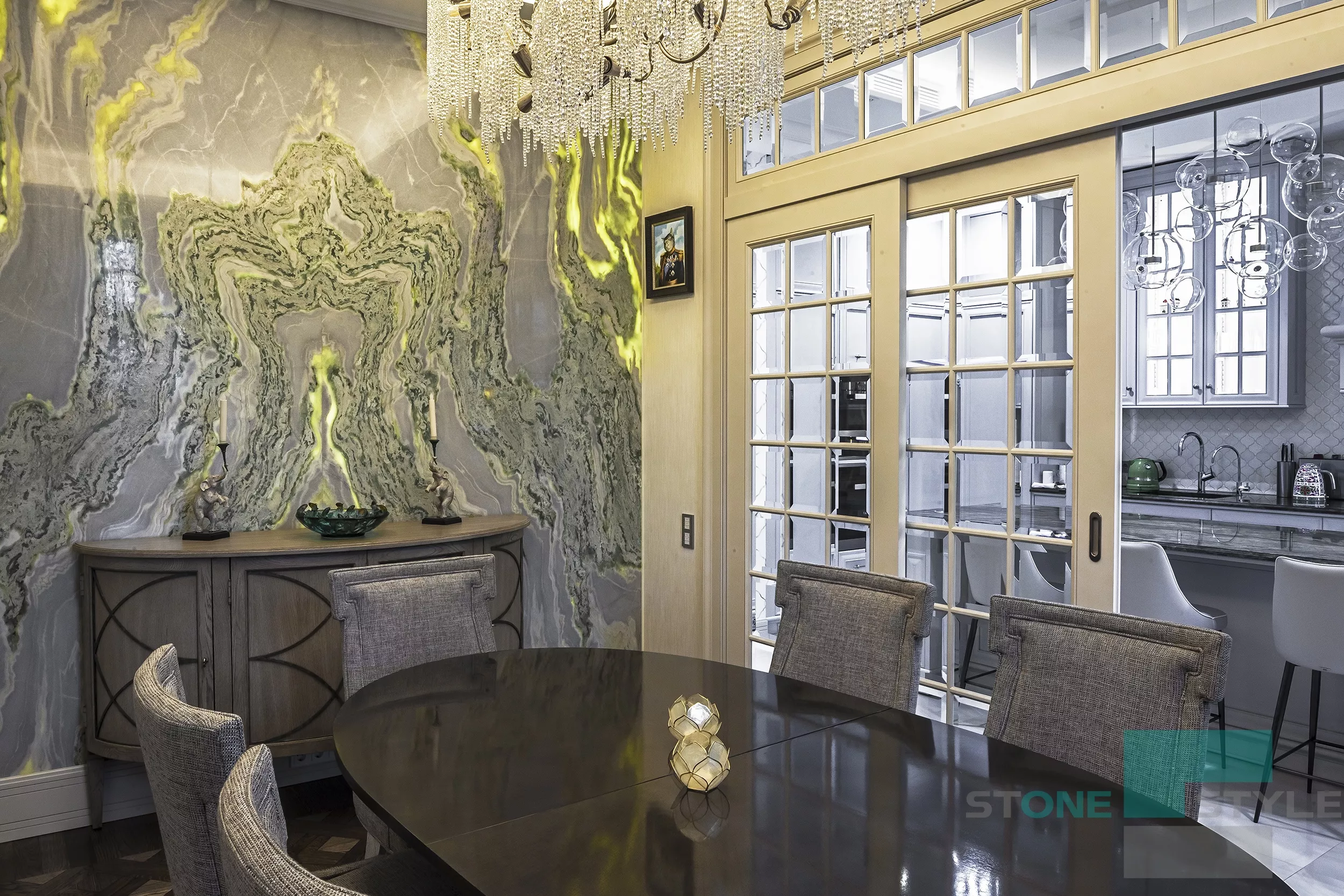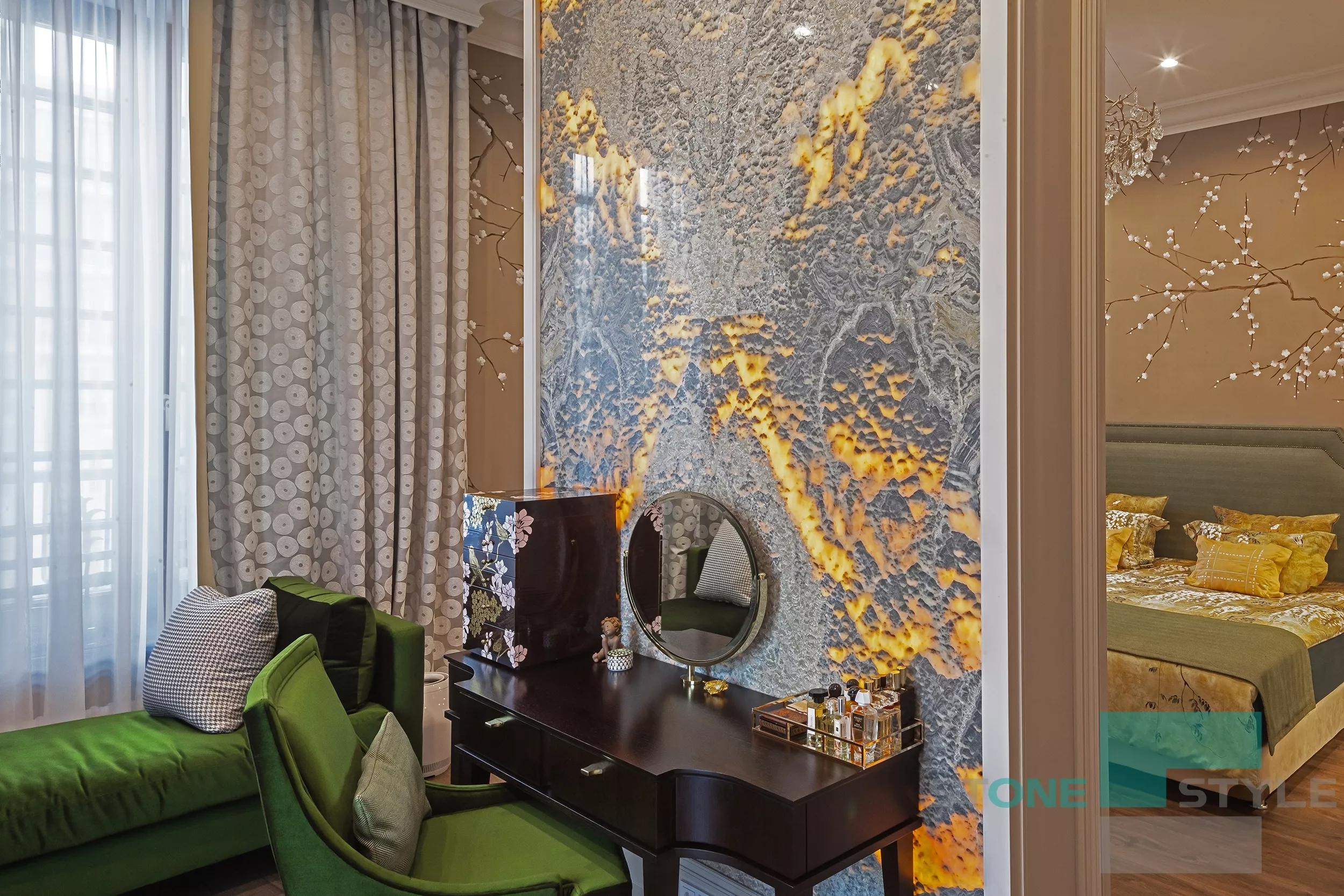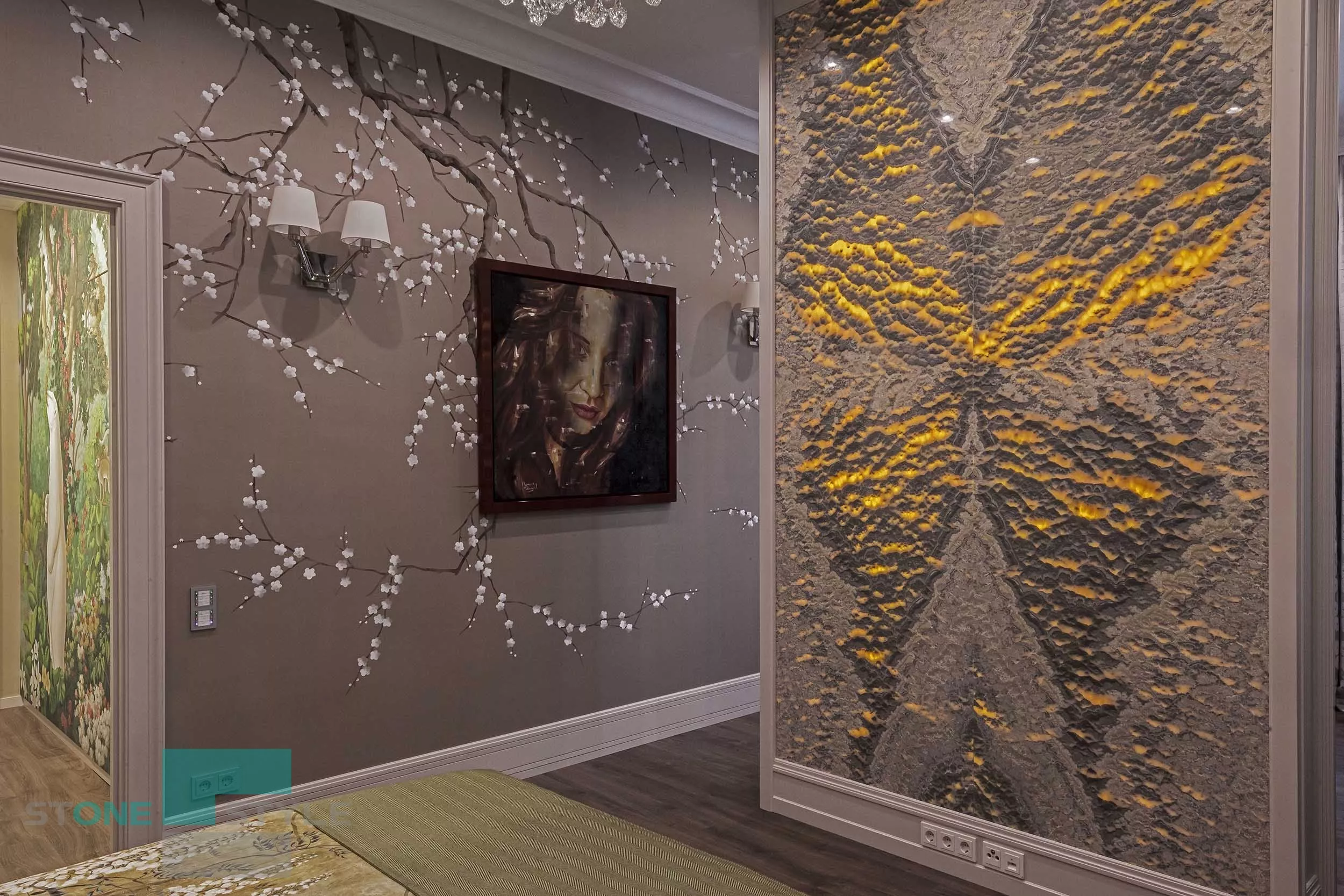 Селекция натурального камня, выполнение инженерных работ, подготовка рабочих чертежей, монтажной карты, раскладка "бабочкой", полировка изделий с нанесением кристаллизатора и художественной реставрации межплиточных швов, выполнение панелей из оникса на просвет, разработка системы подсветки, установка оникса на просвет под ключ, выполнение индивидуальных изделий из натурального кварцита и мрамора.