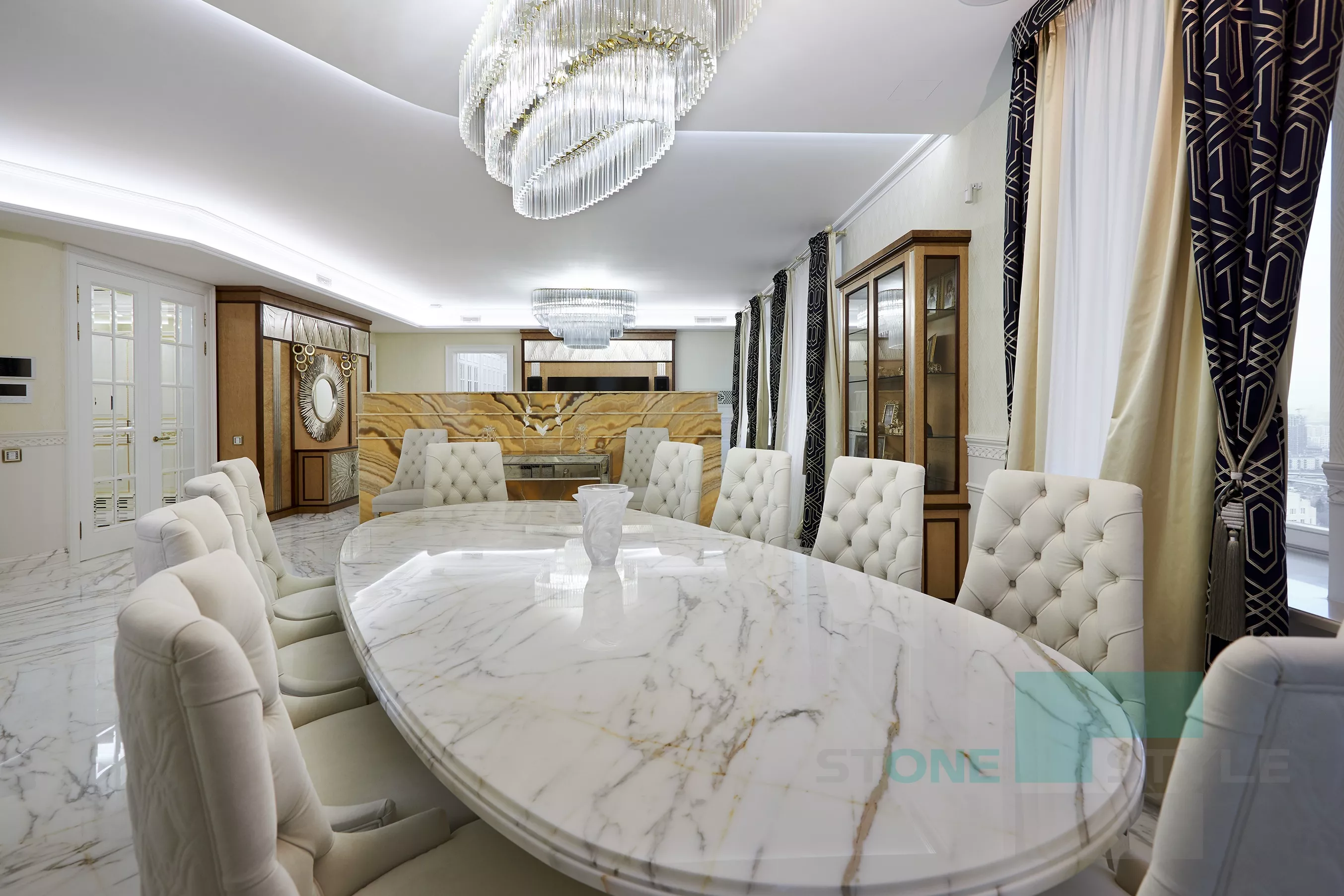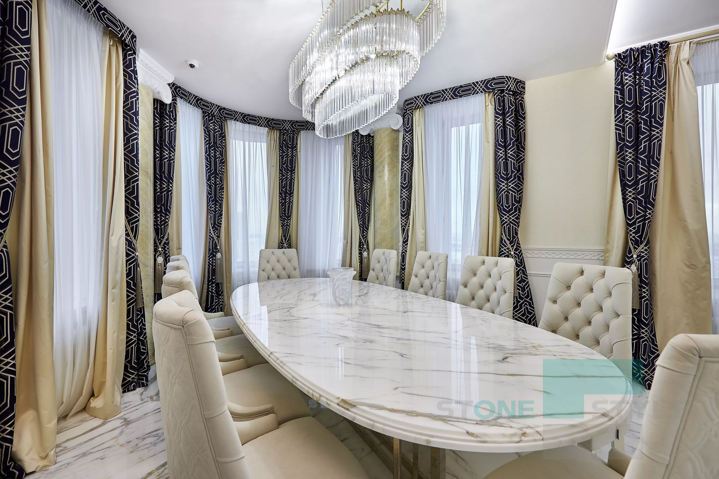 Селекция натурального камня, выполнение инженерных работ, подготовка рабочих чертежей, монтажной карты, раскладка мраморного пола "бабочкой", полировка мраморного пола с нанесением кристаллизатора и художественной реставрации межплиточных швов, проектирование и создание столов из кварцита и мрамора по индивидуальному проекту, разработка конструкции из металла под столы из камня, выполнение стойки из оникса на просвет, разработка системы подсветки, установка оникса на просвет под ключ, выполнение индивидуальных изделий из натурального кварцита, кальцита и мрамора.