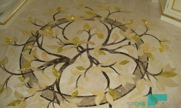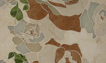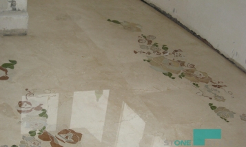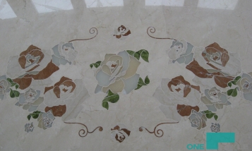 Заказчиком была поставлена задача изготовления мраморного пола с элементами инкрустации в виде цветов из камня разных цветов.