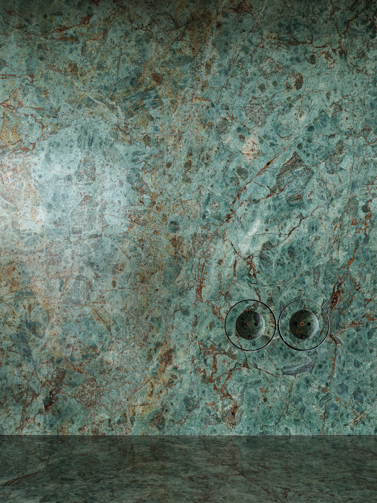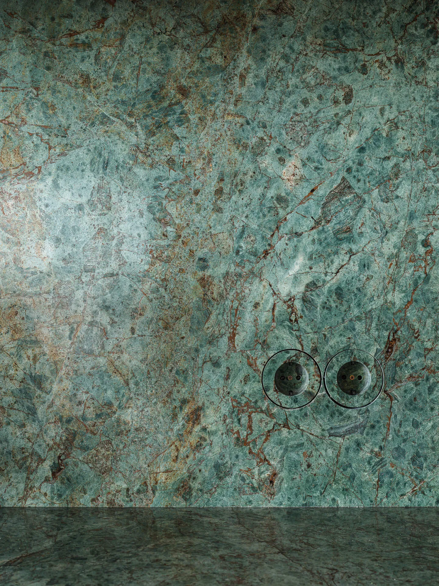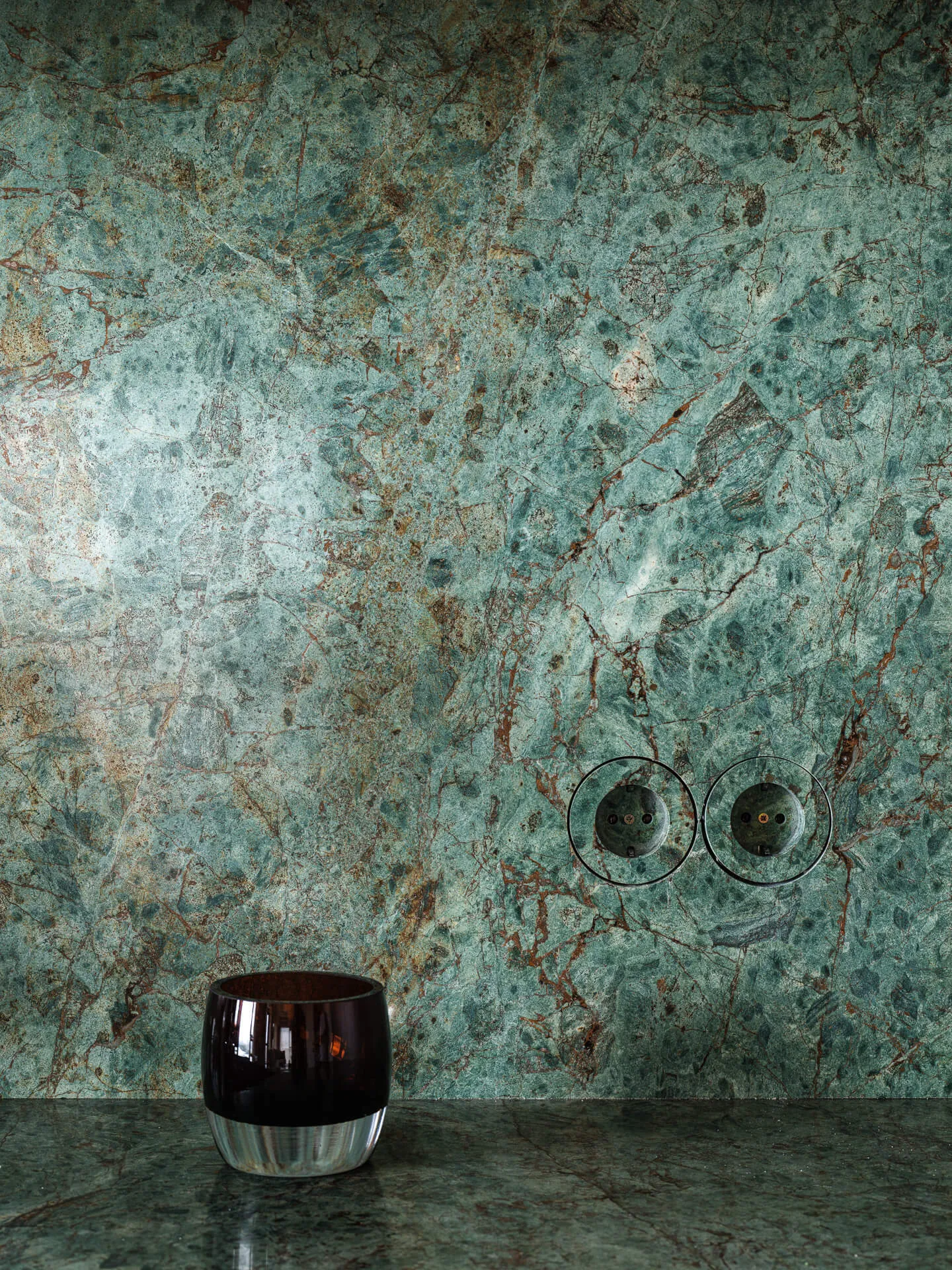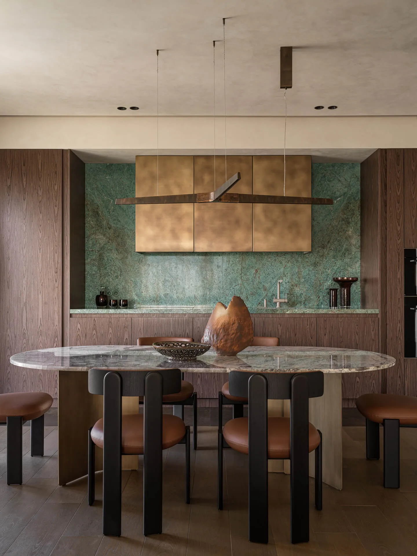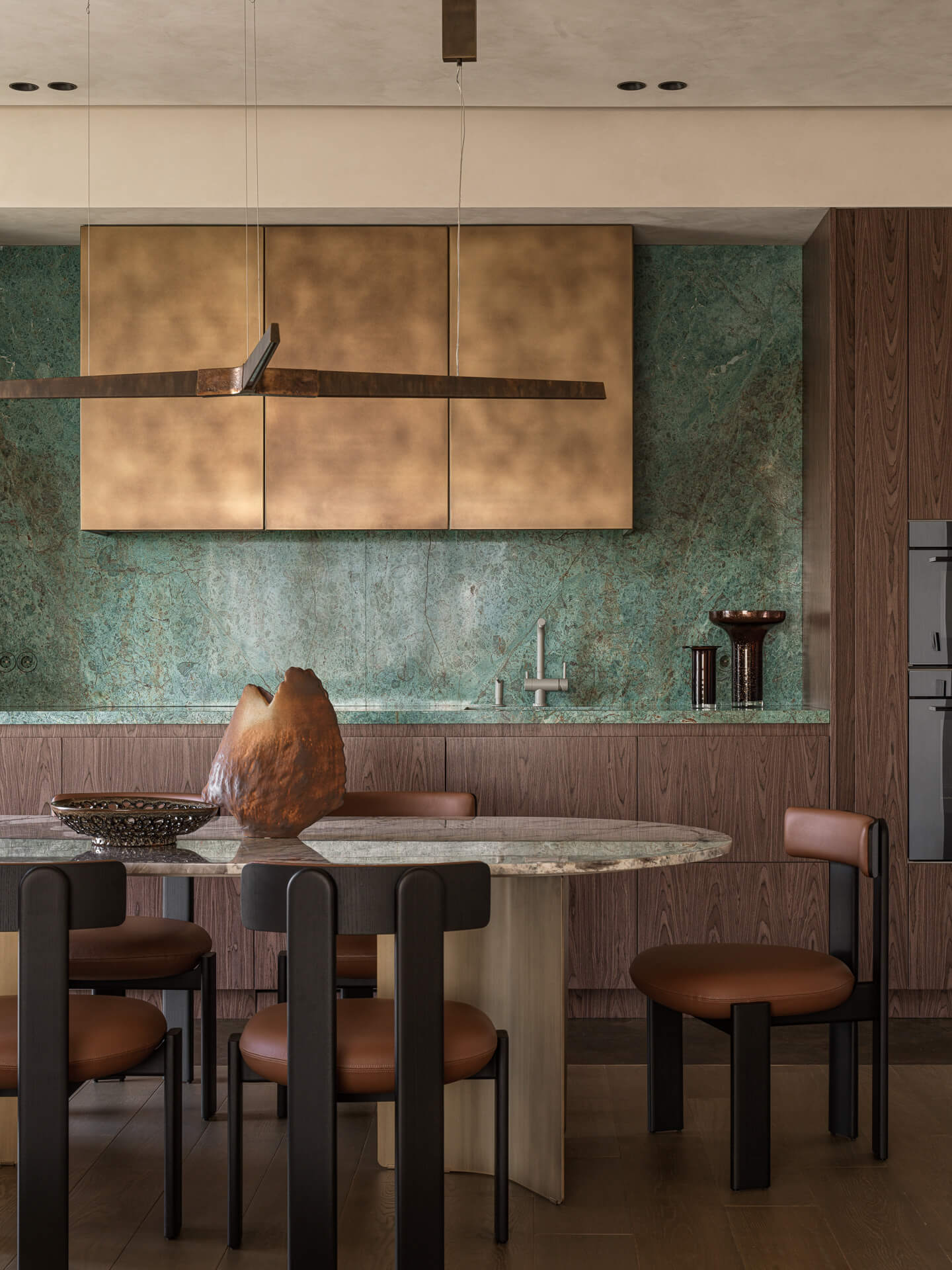 Представляем вам результат нашей кропотливой работы — кухня, где каждая деталь продумана до мелочей. Особое внимание заслуживает сочетание столешницы и фартука из гранита Biryuza. Этот материал не просто украшает пространство, но и задаёт ему характер: глубокий зелёный оттенок с природными прожилками создаёт эффект благородного мрамора.