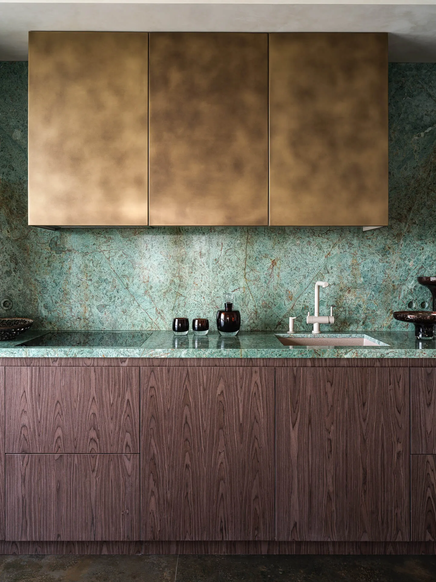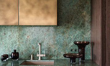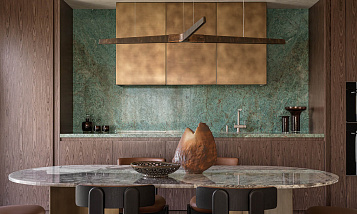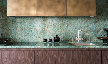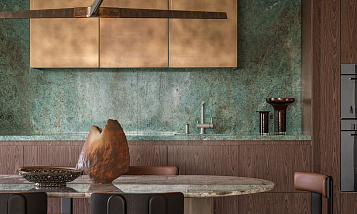 Эксклюзивный материал: гранит Biryuza — редкость в интерьерах. Его текстура и цвет делают кухню уникальной. Практичность: гранит устойчив к царапинам, перепадам температур и бытовой химии — идеально для кухни! Гармония в деталях: сочетание с тёплыми деревянными фасадами и золотистыми верхними шкафами создаёт баланс между современностью и классикой. Эргономика: продуманная глубина столешницы и расположение мойки делают пространство удобным для готовки.