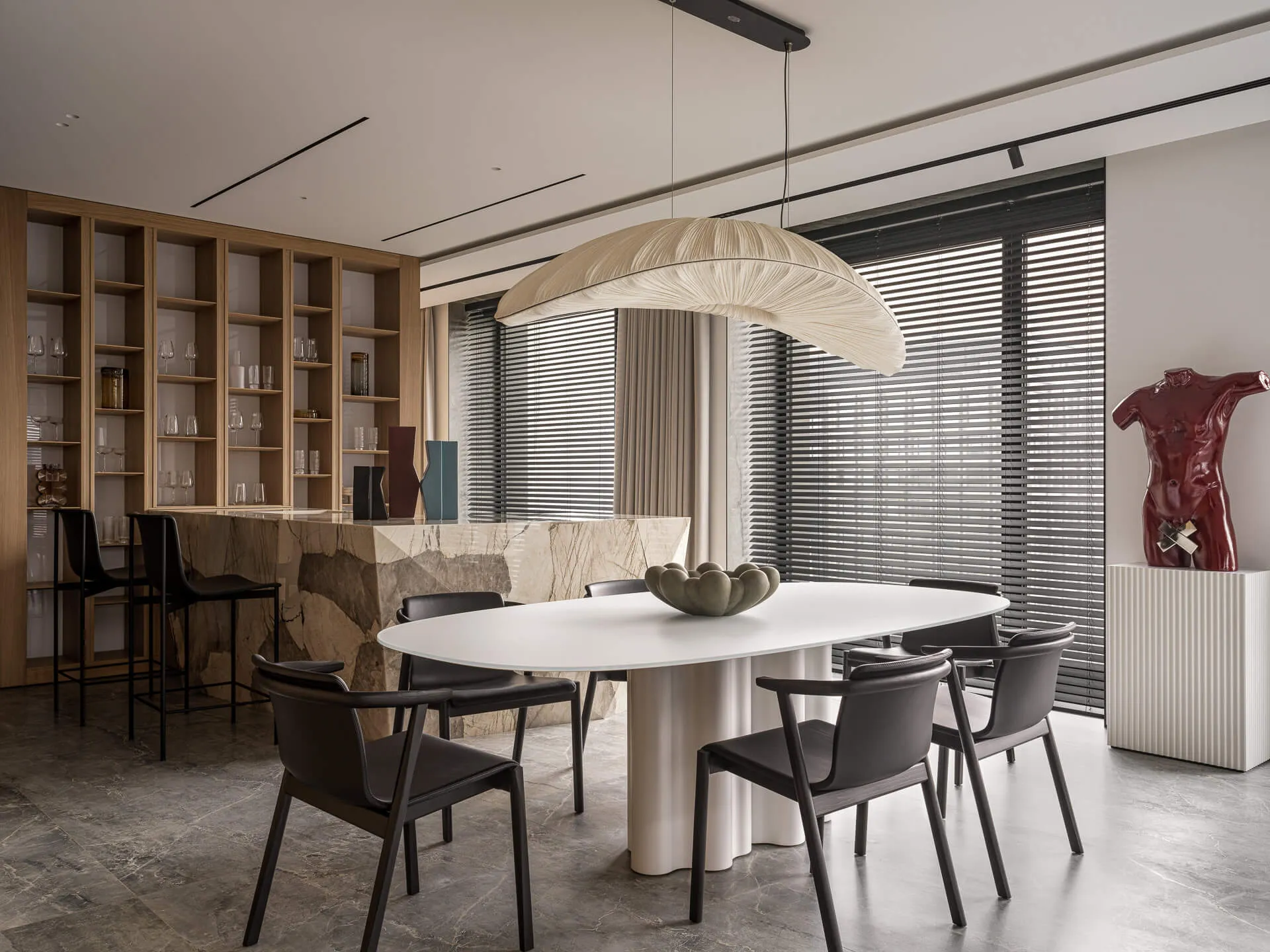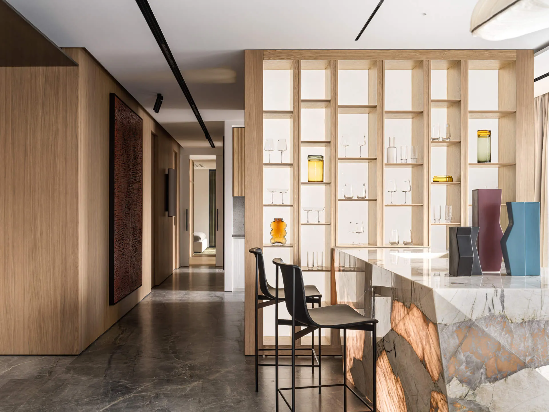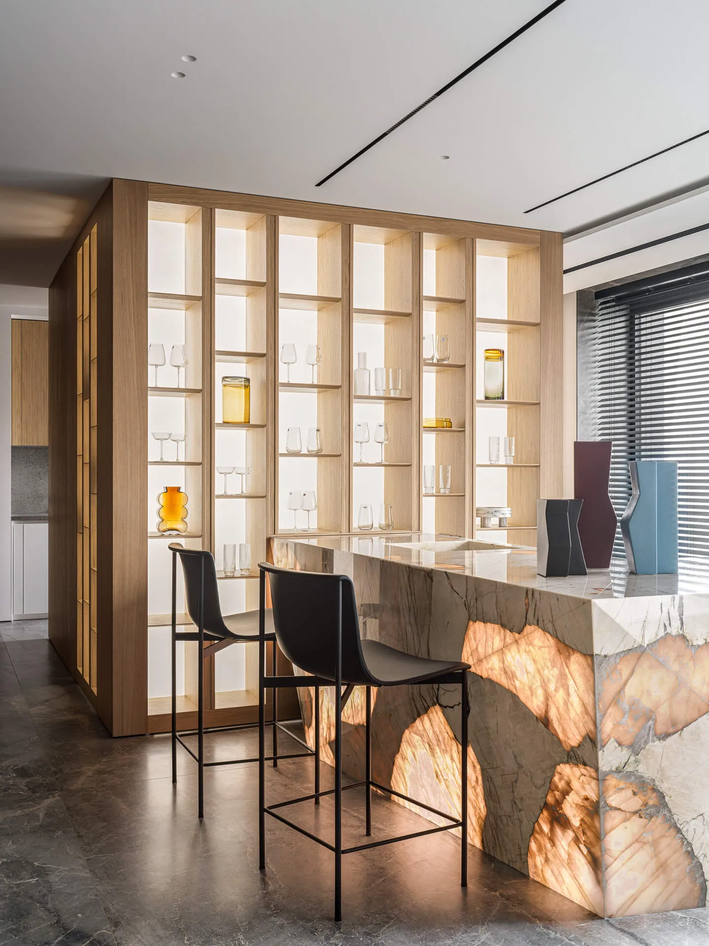 Стеновые панели выполнены из мрамора Silk Georgette и кварцита Patagonia, барная зона - из натурального кварцита Patagonia.