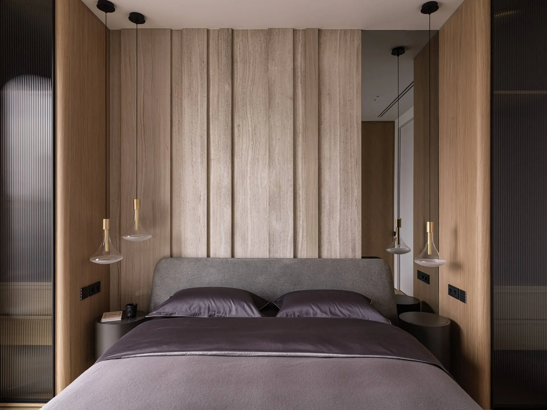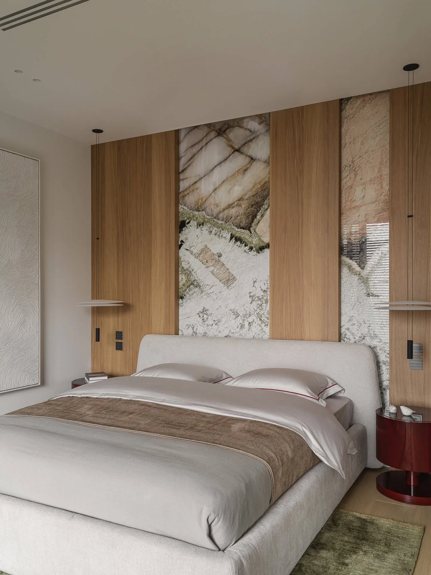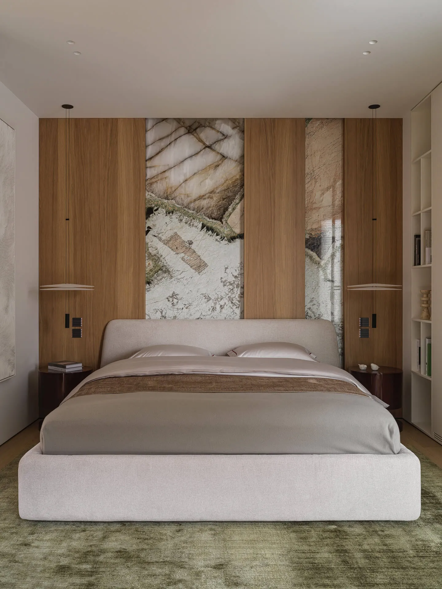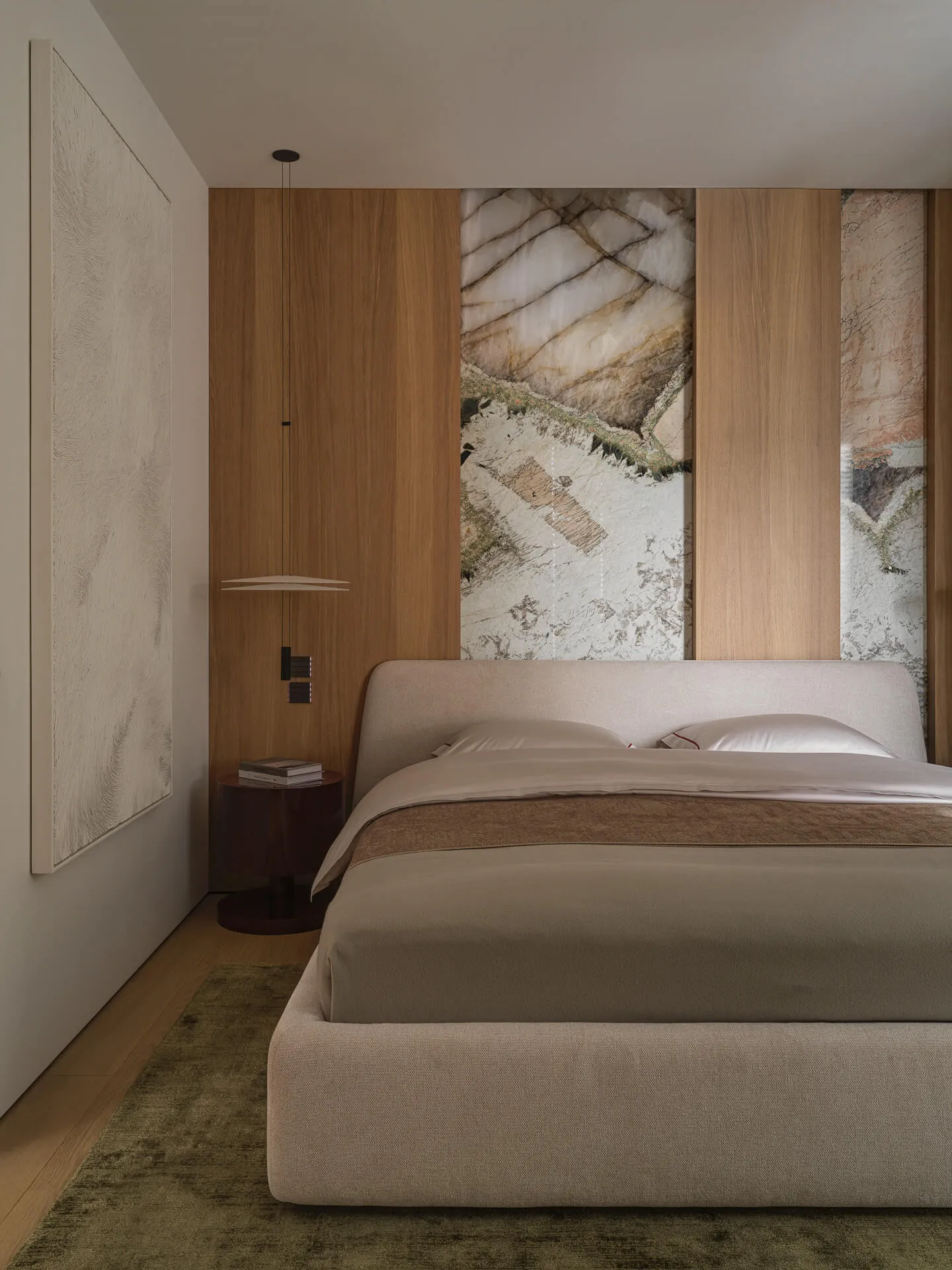Стеновые панели выполнены из мрамора Silk Georgette и кварцита Patagonia, барная зона - из натурального кварцита Patagonia.